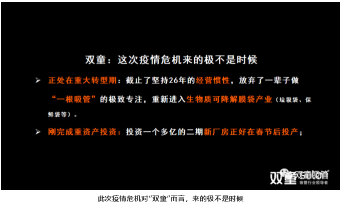 面對此次疫情危機對“雙童”帶來(lái)的巨大影響和挑戰,“雙童”在堅守實(shí)業(yè)的同時(shí)選擇擁抱變化,突破固有思維,不再僅僅只做一根吸管,堅持發(fā)展企業(yè)“第二曲線(xiàn)”轉型投產(chǎn)于生物質(zhì)可降解膜袋!
