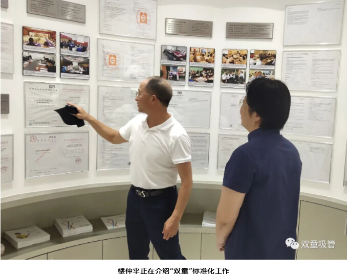 來(lái)到吸管發(fā)展資料展示區時(shí),董事長(cháng)樓仲平介紹道:“‘雙童’一直在推動(dòng)標準化工作創(chuàng )新,給員工提供了施展才華的舞臺。公司的標準化工作都是由以總經(jīng)理李二橋為代表的職工團隊起草編制的,各類(lèi)產(chǎn)品的知識產(chǎn)權都來(lái)源于全體職工的創(chuàng )新思維。十年時(shí)間里,我們的團隊完成了6件國家級標準?!?/span>