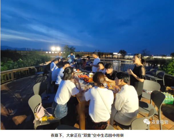 此次活動(dòng)的晚餐安排在“雙童”空中生態(tài)園,隨著(zhù)夜幕降臨,濃濃夜色給就餐氛圍添加了一絲浪漫,伴隨著(zhù)夜幕下的美景,大家邊吃邊聊,相處甚是融洽!