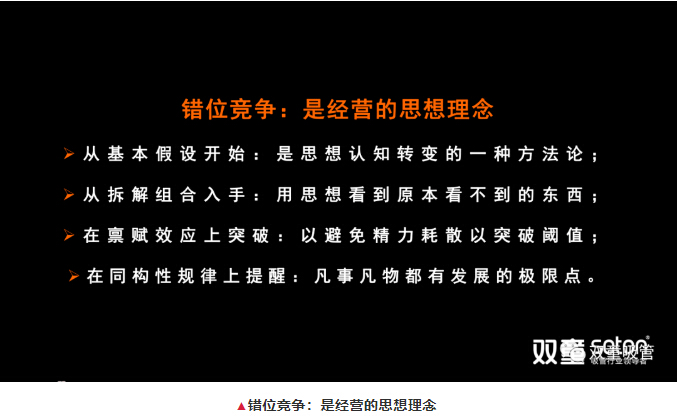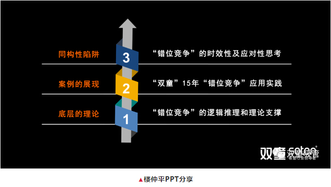 樓仲平從基本假設開(kāi)始,用邏輯推理的方式一層層推進(jìn),分享了“雙童”15年“錯位競爭”的應用實(shí)踐案例,“錯位競爭”的邏輯推理和理論支撐,從而引導大家深入理解錯位競爭是經(jīng)營(yíng)的思想理念,是創(chuàng )新思維的方法論。