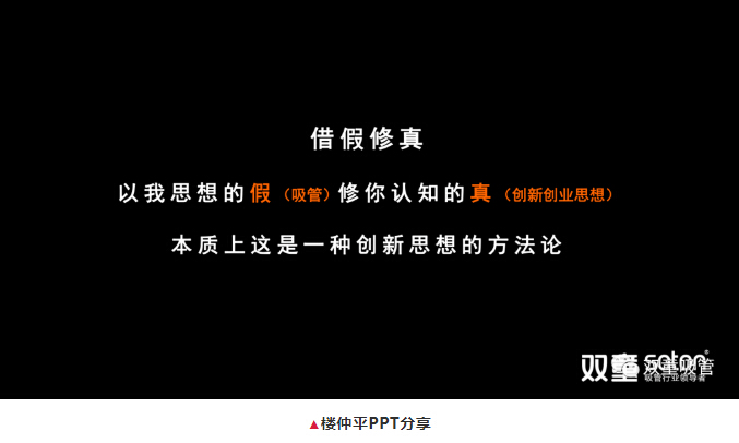在整場(chǎng)課程的分享中,樓仲平始終從思維通道上展開(kāi)分享,引導大家一定要學(xué)會(huì )“借假修真”,也就是以樓仲平思想的假(吸管)修同學(xué)們在認知上的真(創(chuàng )新創(chuàng )業(yè)思想)。