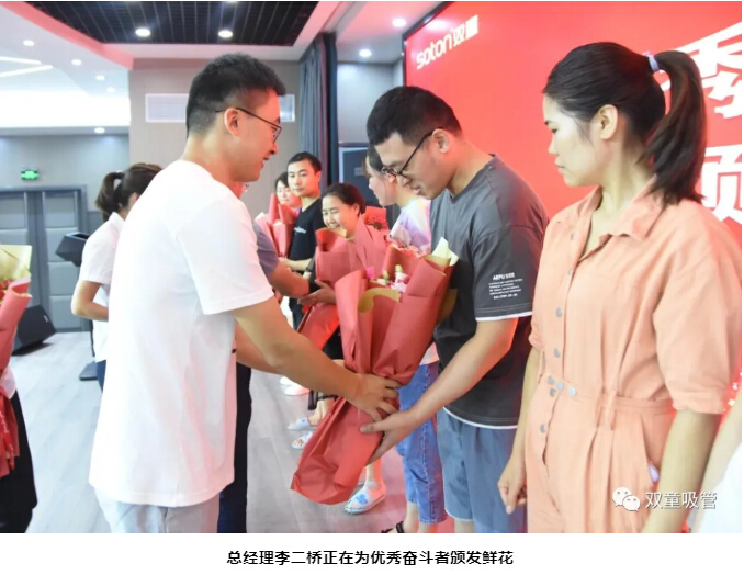 會(huì )上,“雙童”樓仲平及總經(jīng)理李二橋為優(yōu)秀奮斗者們頒發(fā)了鮮花、獎金以及榮譽(yù)證書(shū),并與優(yōu)秀奮斗者們合影留念。