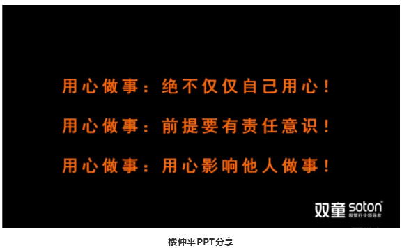 很多來(lái)“雙童”參觀(guān)的人,都很好奇“雙童”何以能把“一根小吸管”做到全球第一?樓仲平會(huì )在參觀(guān)交流分享時(shí)給出一個(gè)四字答案:“用心做事”。