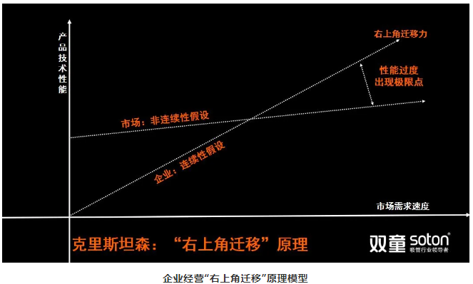 而在這個(gè)過(guò)程中,當企業(yè)經(jīng)營(yíng)的“右上角遷移”力高于市場(chǎng)需求端客戶(hù)訴求的“右上角遷移”力時(shí),將會(huì )出現極限點(diǎn),即“性能過(guò)度”。