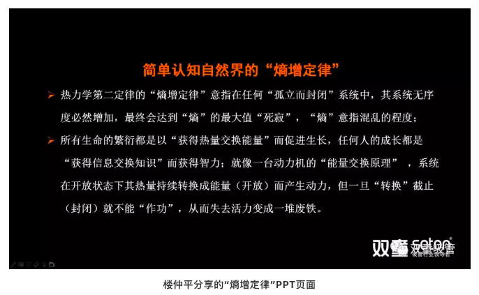 “雙童”樓仲平也曾多次在課程分享中引用熱力學(xué)第二定律的“熵增定律”,把“雙童”存在的問(wèn)題通過(guò)自然的現象加以挖掘、頗析、呈現、對照,從而來(lái)尋求問(wèn)題解決的方法。