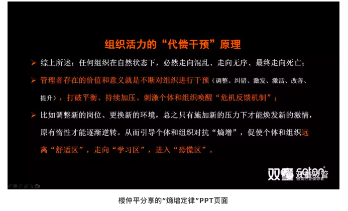 而避免“熵增”的唯一方法就是管理者持續開(kāi)放和組織干預,從而打破平衡,持續加壓、刺激個(gè)體和組織喚醒“危機反饋機制”,從而讓個(gè)體和組織遠離“舒適區”,走向“學(xué)習區”,進(jìn)入“恐慌區”,原有惰性才能逐漸逆轉,從而煥發(fā)出新的活力!
