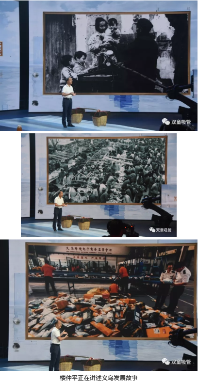 在節目現場(chǎng),“雙童”樓仲平也帶來(lái)了許多精彩的照片。其中,開(kāi)場(chǎng)照片便是義烏這座城市的對比照片。通過(guò)挑貨郎與義烏小商品城開(kāi)展全球電商的照片對比,樓仲平講述了義烏如何從貧瘠落后的小縣城發(fā)展為全球最大的小商品集散中心的故事……