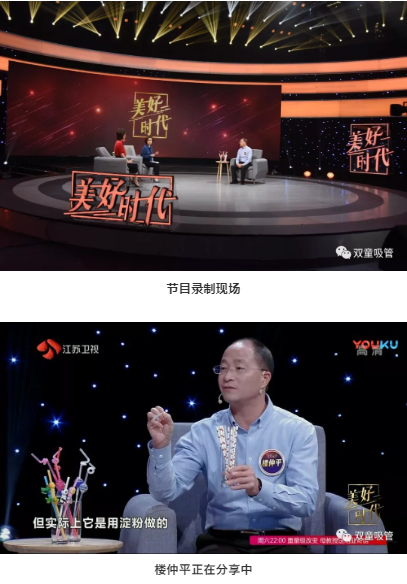 在“雙童”樓仲平上場(chǎng)后,主持人趙丹軍就被桌子上的各類(lèi)吸管所吸引啦!樓仲平也向在場(chǎng)觀(guān)眾介紹了美觀(guān)環(huán)保的可降解吸管和極具特色的創(chuàng )新吸管。