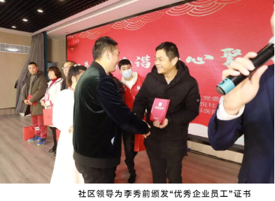 隨著(zhù)晚會(huì )的高潮出現,激動(dòng)人心的頒獎環(huán)節也開(kāi)始了。晚會(huì )對在疫情防控、文明創(chuàng )建、攻堅克難任務(wù)中甘于奉獻、勇于擔當的企業(yè)先進(jìn)工作者、優(yōu)秀志愿者、優(yōu)秀居民代表、網(wǎng)格標兵、最具工匠精神者、傳承風(fēng)尚者予以表彰!值得一提的是,“雙童”員工李秀前被授予了“優(yōu)秀企業(yè)員工”榮譽(yù)稱(chēng)號。