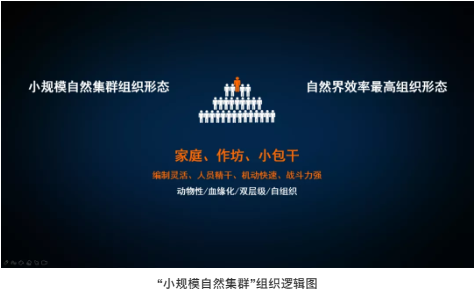 其中,樓仲平重點(diǎn)通過(guò)幾幅思維邏輯圖PPT,展現了在不同組織關(guān)系下的企業(yè)發(fā)展形態(tài)。從最原始的“小規模自然集群組織”邏輯圖上,我們能發(fā)現這種“雙層級”形式在規模較小時(shí),編制靈活,人員精干,機動(dòng)快速,戰斗力強,是十分高效的組織形態(tài)。但當規模不斷擴張下,非常容易導致管理混亂的情況。