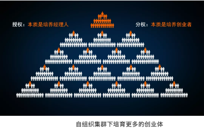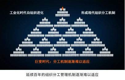但工業(yè)化時(shí)代來(lái)臨后,為了滿(mǎn)足標準化大規模生產(chǎn)需要,以家庭血緣關(guān)系為紐帶的自組織被現代金字塔型的分工管理組織形態(tài)所替代。這種機制為直線(xiàn)管理、授權管控、責權分明、組織形態(tài)呈現穩定而僵化。所以,在當今巨變時(shí)代下,當企業(yè)內在變化難以滿(mǎn)足成員內在訴求變化時(shí),組織缺陷就暴露無(wú)遺,規模不斷擴張下,管控的難度呈現出指數級放大。