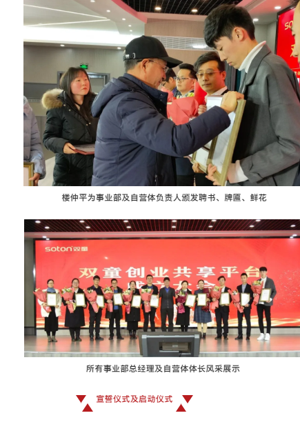接下來(lái),就是激動(dòng)人心的聘任授牌儀式環(huán)節。所有事業(yè)部及自營(yíng)體的負責人依次上臺,從樓仲平手中接過(guò)代表著(zhù)責任和擔當的聘任證書(shū)、榮譽(yù)牌匾及鮮花!