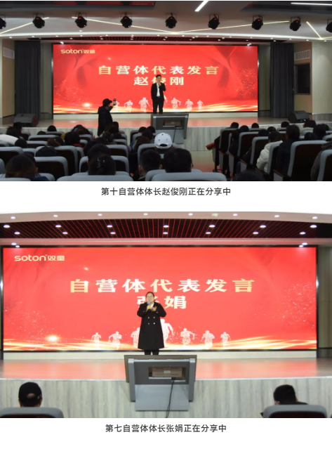 隨著(zhù)“雙童”創(chuàng )業(yè)共享平臺的正式成立,第五事業(yè)部總經(jīng)理周上、第三事業(yè)部總經(jīng)理孟竹燕、第十自營(yíng)體體長(cháng)趙俊剛、第七自營(yíng)體體長(cháng)張娟作為創(chuàng )業(yè)體代表先后上臺分享,發(fā)自肺腑分享自己的感受,激勵大家為“雙童”更好的明天努力奮斗!