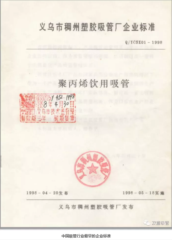 “所有進(jìn)入主流超市的產(chǎn)品都需要在包裝上有條形碼。如果要申請產(chǎn)品條形碼,企業(yè)必須要制定相關(guān)產(chǎn)品的企業(yè)標準?!睒侵倨揭庾R到,若沒(méi)有企業(yè)標準就無(wú)法進(jìn)入到主流高端市場(chǎng),于是他就下決心開(kāi)始制定企業(yè)的產(chǎn)品標準。終于,在1997年10月,由雙童前身義烏市稠州塑膠吸管廠(chǎng)起草的《聚丙烯飲用吸管》企業(yè)標準順利通過(guò)審核,于1998年4月正式發(fā)布,成為吸管行業(yè)最早的產(chǎn)品標準。從此,雙童打開(kāi)了產(chǎn)品在商超場(chǎng)所的銷(xiāo)售渠道,實(shí)現了傳統家庭作坊式企業(yè)向正規工廠(chǎng)的轉型。