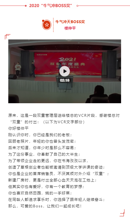 2020年是疫情突發(fā)年,我們的產(chǎn)值也受到了前所未有的挑戰,國外貿易大幅下降,幸而國內貿易在今年異軍突起。在此,我對“雙童”所有員工表示感謝。馬上2021年迎面向我們走來(lái),而2021年又是充滿(mǎn)機會(huì )和挑戰的一年,我們面前只有一條路:做好自己、迎接挑戰、創(chuàng )造未來(lái)!除了給優(yōu)秀奮斗者頒發(fā)了獎項之外,“雙童”全體員工還為我們的Boss——樓仲平準備了一個(gè)驚喜!到底是什么驚喜呢?戳視頻一起來(lái)看看:最后,總經(jīng)理李二橋現場(chǎng)為樓總頒發(fā)了“牛氣沖天BOSS獎”!愿公司在兩位Boss的帶領(lǐng)下,“雙童”在2021年度能夠能蒸蒸日上,越來(lái)越好!