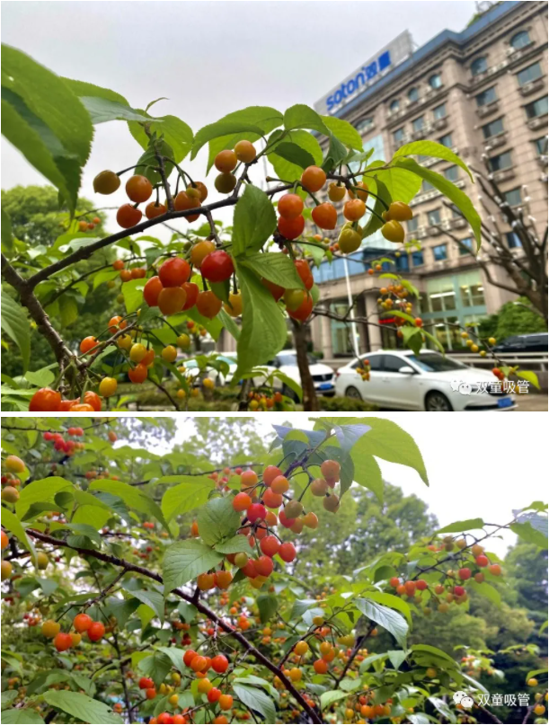 看!“雙童”的櫻桃樹(shù)上綴滿(mǎn)了櫻桃果,茂密的櫻葉也遮蓋不住紅橙相間的果實(shí)?!靶艋\”們散發(fā)出陣陣誘人果香,讓人不禁胃口大開(kāi),口水直流!
