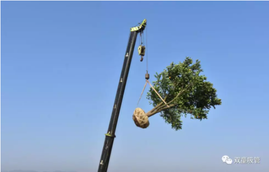 吊機把一棵棵果樹(shù)送上“雙童”二期廠(chǎng)房樓頂