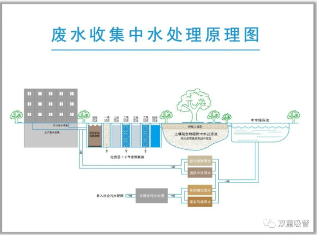 最后,經(jīng)過(guò)處理的水可以達到了三類(lèi)水的標準,不能直接飲用和觸碰皮膚,但可以用于廠(chǎng)區綠化噴淋、所有洗手間抽水馬桶沖洗用水和道路清洗。這讓員工日常生活中所產(chǎn)生的廢水不僅得到循環(huán)利用,而且還消滅了企業(yè)的廢水排放和污染,同時(shí)一年還能為企業(yè)節省了三百多萬(wàn)的費用,讓600人的工廠(chǎng)不用一噸自來(lái)水! “雙童”一期廠(chǎng)區:廢水收集處理循環(huán)利用示意圖