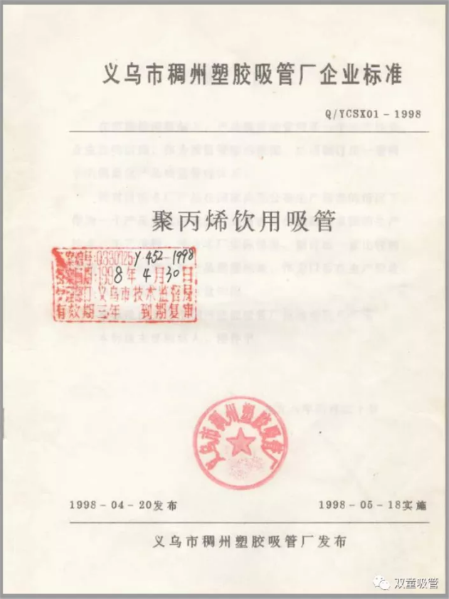 終于在1997年10月,由“雙童”前身的義烏市稠州塑膠吸管廠(chǎng)起草的《聚丙烯飲用吸管》企業(yè)標準順利通過(guò)審核,于1998年4月正式發(fā)布,成為當時(shí)中國吸管行業(yè)最早的產(chǎn)品標準。從此,“雙童”打開(kāi)了產(chǎn)品在商超場(chǎng)所的銷(xiāo)售渠道,實(shí)現了傳統家庭作坊企業(yè)向正規工廠(chǎng)的轉型。