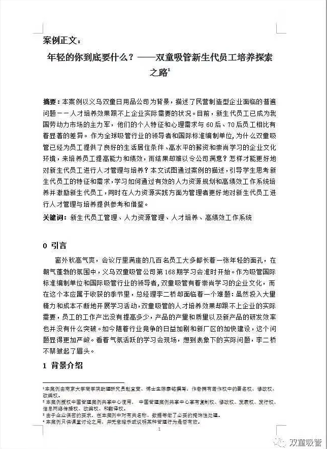 截止到目前,以“雙童”為主題的案例進(jìn)入到國家案例庫的數量就高達5件。其中南京商學(xué)院研究案例《年輕的你到底要什么?——雙童吸管新生代員工培養探索之路》、浙江工業(yè)大學(xué)研究案例《以小博大,一根吸管的藍海之旅》兩件研究案例更是被評為了2016年度百優(yōu)案例!浙江工業(yè)大學(xué)研究案例《以小博大,一根吸管的藍海之旅》還成為了2017年精英賽總決賽的案例!