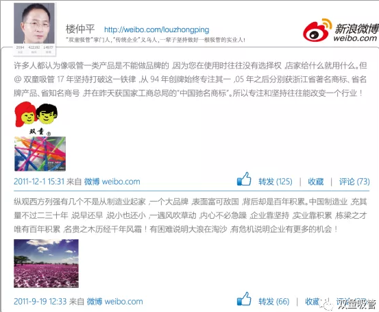 我有一個(gè)比較好的習慣就是愿意不斷地學(xué)習,我盯住一件事情就會(huì )持續去關(guān)注其發(fā)展動(dòng)態(tài)并做長(cháng)遠的規劃,我覺(jué)得我們的品牌塑造也是一個(gè)由低級到高級的運作過(guò)程,積累初期因為沒(méi)有經(jīng)驗,只能選擇在一些書(shū)刊和戶(hù)外廣告的途徑做一些簡(jiǎn)單的廣告推廣,之后我們利用互聯(lián)網(wǎng)優(yōu)勢取得突破。再之是致力于企業(yè)的亮點(diǎn),利用社會(huì )化媒體密集傳播而形成口碑傳播??梢哉f(shuō)“雙童吸管”的馳名商標認定,幾乎不靠廣告推廣,前后十五年的時(shí)間,直接的廣告支出幾乎不超過(guò)五百萬(wàn),而省下來(lái)的大部分經(jīng)費都花到企業(yè)文化的價(jià)值觀(guān)塑造和傳播上。