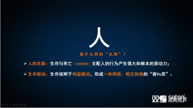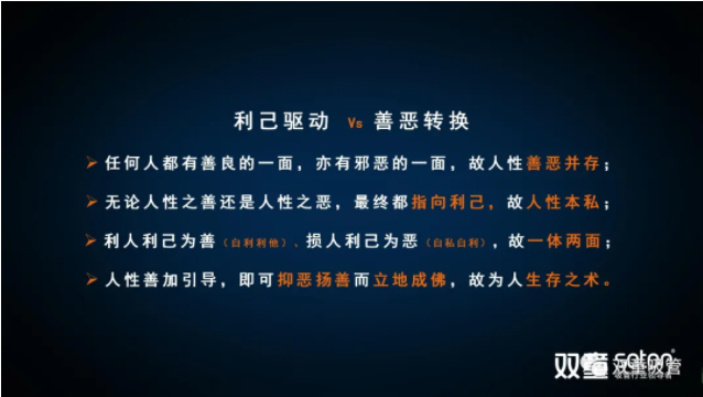 從上圖中大家可以看到,無(wú)論人性之善還是人性之惡,其實(shí)都包含“利己驅動(dòng)”。“利己”是人在長(cháng)期的自然環(huán)境中為了獲得生存不得不獲得更多外部資源的內在驅動(dòng)力,從而導致人總是會(huì )從利己的角度去考慮如何更快、更多的獲得。所以“人性本私”是無(wú)可非議的。