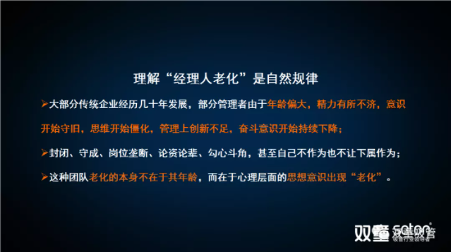接下來(lái),樓老師通過(guò)“雙童”十年前的案例闡述“雙童”遇到的“經(jīng)理人老化”問(wèn)題: