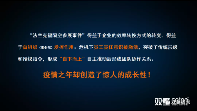 隨后,樓老師通過(guò)“法蘭克福隔空參展事件”,讓大家深刻意識到這種機制催生的巨大活力?!半p童”第三事業(yè)部在2020年2月疫情危機下,自主經(jīng)營(yíng)的員工責任意識被激活,在眾多不利環(huán)境下突破了傳統層級和授權指令,實(shí)現“自下而上”推動(dòng)后形成了緊密的團隊協(xié)作關(guān)系。在眼看參展無(wú)望的絕境下竭盡所能,核心成員通過(guò)創(chuàng )新方式和遠程視頻遙控的方式聘請德國慕尼黑工業(yè)大學(xué)的留學(xué)生全程參展,從而獲得了五年以來(lái)最好的參展效果,在疫情之年取得了驚人的成長(cháng)性。