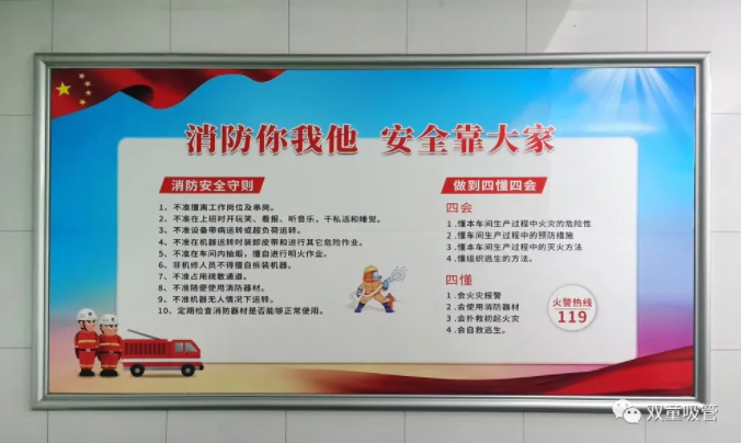 在“雙童”,各類(lèi)宣傳標識、消防器材隨處可見(jiàn),安全意識深入人心!正是因為“雙童”對安全生產(chǎn)的這份敬畏之心,才讓每一位員工心中都筑起了一道安全防線(xiàn)。