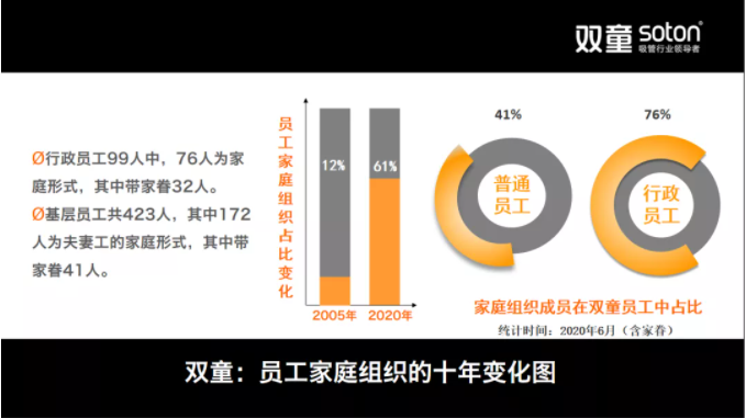 ▲ 60%員工為家庭模式,比05年增加了5倍“雙童”在“家文化”推行過(guò)程當中,讓員工能夠安心地在公司工作、生活、戀愛(ài),形成了濃厚的“家文化”氛圍!直到現在,已經(jīng)有140個(gè)家庭在“雙童”落戶(hù),其中最多的一家有11個(gè)人住在公司。其中,有的把父母和孩子接過(guò)來(lái)一起照料,也有單身漢在“雙童”找到人生伴侶,擁有了幸福的家庭。