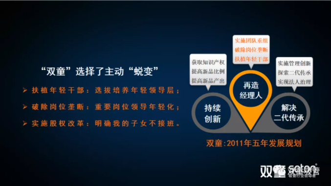 2010年底開(kāi)始,“雙童”中高層管理團隊便被要求一起學(xué)習德魯克思想,通過(guò)共同學(xué)習的方式,促進(jìn)德魯克思想在經(jīng)營(yíng)層面的管理實(shí)踐。在之后短短三年時(shí)間里,“雙童”確立“再造經(jīng)理人”制度,催生出新生代經(jīng)理人團隊,到確立法人治理、建立企業(yè)傳承的機制,推動(dòng)“雙童”從家庭作坊到現代化企業(yè)徹底轉型。