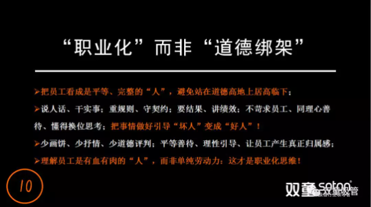 在“理性”思維的持續引導下,“雙童”在文化中倡導把員工看成是平等、完整的“人”,而非站在道德高地上居高臨下,處處體現尊重、公平和雙贏(yíng)。我們理解員工是有血有肉的“人”,而非單純的勞動(dòng)力,對待員工少“畫(huà)餅”,少抒情,懂得換位思考,不去“道德綁架”員工,才能讓員工真正產(chǎn)生歸屬感。