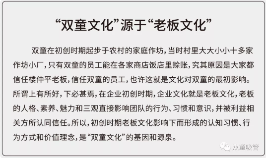 深究這其中的原因,都是大家對樓仲平的信任,從而對“雙童”的員工也產(chǎn)生了信任,最初的企業(yè)文化更多來(lái)源于老板文化。在企業(yè)初創(chuàng )時(shí)期,老板的人格、素養和魅力(三觀(guān))直接影響團隊的行為、習慣和意識,并被利益相關(guān)方所認同信任。所以,初創(chuàng )時(shí)期老板文化影響下而形成的認知習慣、行為方式和價(jià)值理念,是“雙童文化”的基因和源泉。