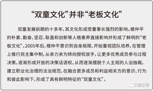 在改革過(guò)程中,樓仲平重視團隊培養,在管理上推行民主集中制,從親力親為轉向授權放手,讓更多優(yōu)秀成員參與過(guò)程決策,逐漸形成開(kāi)放的決策話(huà)語(yǔ)圈。從而逐漸擺脫個(gè)人主觀(guān)的人治獨裁,建立職業(yè)化治理的法治規范,在融合更多成員和利益相關(guān)方的意識、行為和彼此影響下,形成了具有鮮明特征的“雙童文化”。