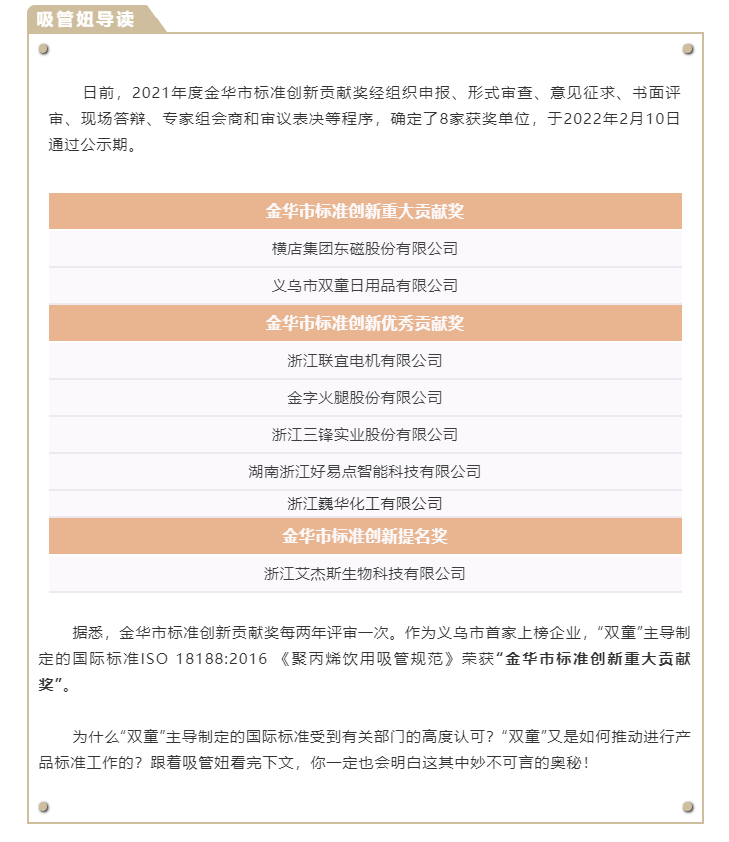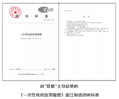 在此過(guò)程中,樓仲平帶領(lǐng)“雙童”緊隨市場(chǎng)發(fā)展的步伐,相繼在2014-2016年期間主導起草制定了《聚乳酸冷飲吸管》中國行業(yè)標準和浙江團體標準,在2019年又主導起草編制了《一次性紙質(zhì)飲用吸管》浙江團體標準。