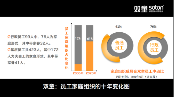 “雙童”在“家文化”推行過(guò)程當中,讓員工能夠安心地在公司工作、生活、戀愛(ài),形成了濃厚的“家文化”氛圍!直到現在,已經(jīng)有140個(gè)家庭在“雙童”落戶(hù),其中最多的一家有11個(gè)人住在公司。其中,有的把父母和孩子接過(guò)來(lái)一起照料,也有單身漢在“雙童”找到人生伴侶,擁有了幸福的家庭。