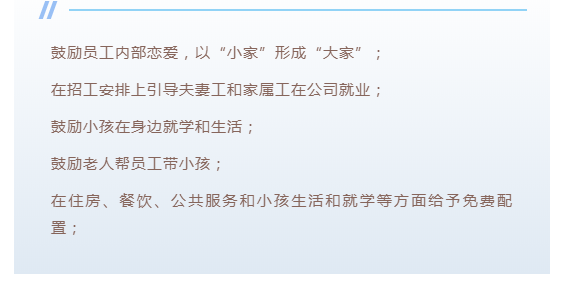 為了能讓員工全身心投入到工作當中,在工作之余不再擔憂(yōu)家庭生活?!半p童”鼓勵價(jià)值型員工將配偶、老人和小孩接到公司就住,最大程度上解決價(jià)值型員工的后顧之憂(yōu)。因此,2004年9月開(kāi)始,“雙童”就明確把中國傳統“家文化”作為員工管理的著(zhù)力點(diǎn):
