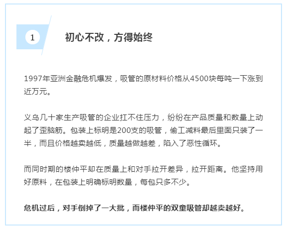 一流的企業(yè)賣(mài)標準,二流的企業(yè)賣(mài)品牌,三流的企業(yè)賣(mài)產(chǎn)品。“雙童”始終踐行“以小博大,成就另一種高度”的經(jīng)營(yíng)理念,堅持以博大的胸懷,將吸管做精、做強、做到極致。