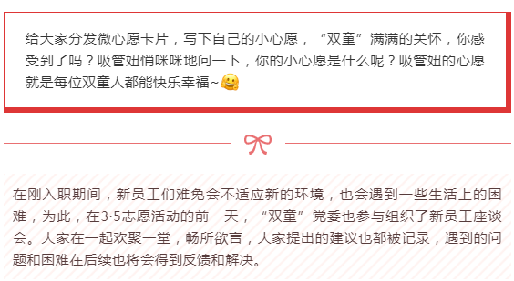 在這溫暖的陽(yáng)春三月,春林初盛, “雙童”黨支部全體穿上“小紅衣”,成為志愿者,進(jìn)行了一次溫暖的慰問(wèn)活動(dòng),讓新員工們能更快地融入“雙童”這個(gè)大家庭。一言一語(yǔ),句句關(guān)懷,大家心里暖如春日。