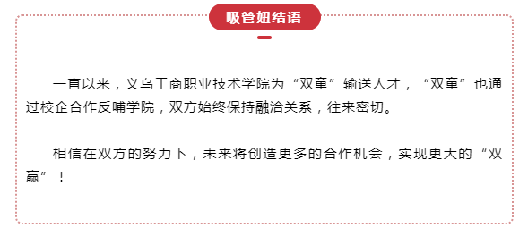 樓仲平指出,校企雙方應該發(fā)揮“雙童”在產(chǎn)教融合型企業(yè)開(kāi)展協(xié)同育人、資源整合等方面的獨特優(yōu)勢。通過(guò)雙童商學(xué)院構建高水平的“產(chǎn)教融合體”,實(shí)現教育和產(chǎn)業(yè)全面融合、形成校企合作可持續發(fā)展的長(cháng)效機制,優(yōu)化“產(chǎn)、學(xué)、研、培”五位一體模式,打造有特色、有深度、可推廣的校企合作義烏新范式。
