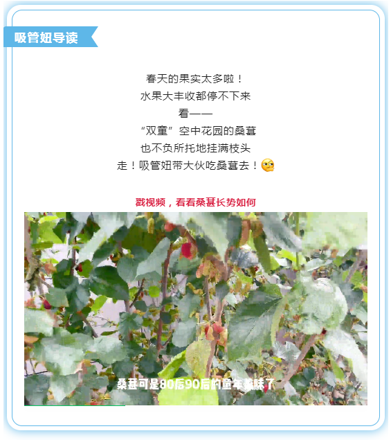 吸管妞已經(jīng)將吃桑葚的做法和注意事項全盤(pán)交代了。除了桑葚之外,在“雙童”還有各種櫻桃樹(shù)、柿子樹(shù)、石榴樹(shù)...…四季豐收,一年到頭都有最新鮮的水果吃!親愛(ài)的粉絲們,這樣的工作環(huán)境你羨慕嗎?