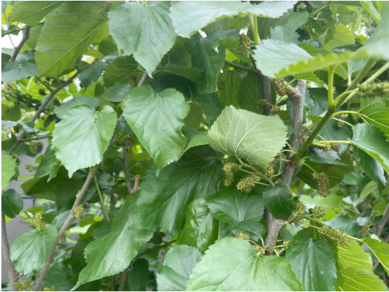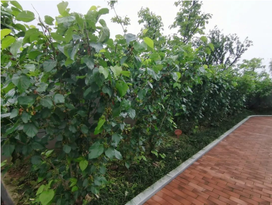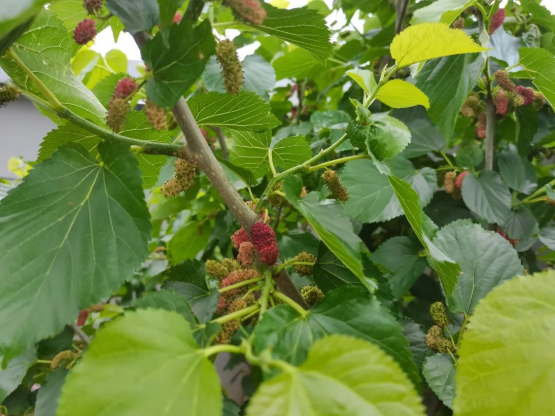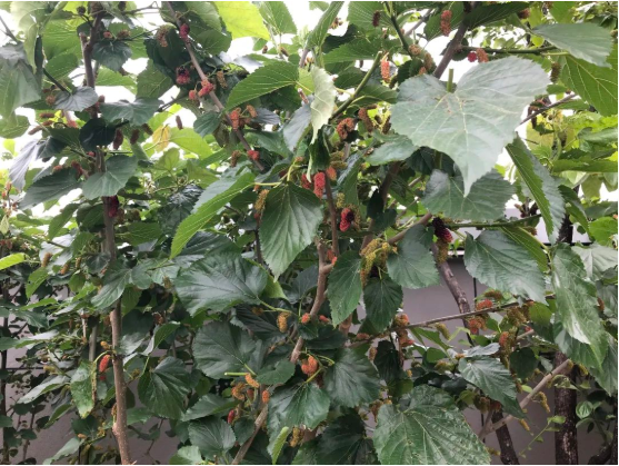 瞧!在“雙童”空中花園里20多棵桑葚樹(shù)都被果實(shí)壓彎了枝頭,一顆顆粒大飽滿(mǎn)的桑葚,在綠葉下若隱若現,沉甸甸的,讓人垂涎欲滴!