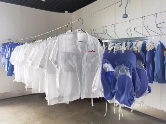 首先,是清洗場(chǎng)所?!半p童”的工服洗衣房就和車(chē)間清洗間配置在一起,既聯(lián)通車(chē)間,提高工服來(lái)回運送的效率,又能夠保持相對獨立,不影響生產(chǎn)。這里的洗衣工具齊全,既有機洗區域,也有供斷電情況使用的手洗池。