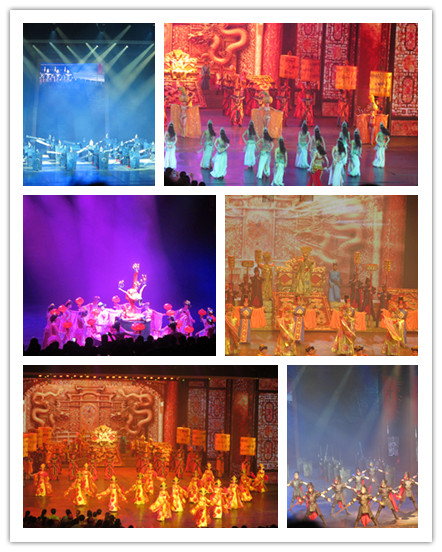 千呼萬(wàn)喚始出來(lái),兩點(diǎn)一到,宋城千古情終于向我們掀開(kāi)了她神秘的面紗。在舞臺上,大氣磅礴的金鑾殿、小橋流水的西湖畔、金戈鐵馬的沙場(chǎng)會(huì )瞬間出現在你的眼前。燈光璀璨中,霓裳羽衣跳出一段絕代風(fēng)華,金剛鐵甲演繹一段壯烈的歷史之歌,青蘿粉衣更是帶來(lái)了一段難忘的愛(ài)情故事。笙歌管弦、歌舞雜技,此起彼伏,熱鬧非凡,一派歌舞升平的景象。