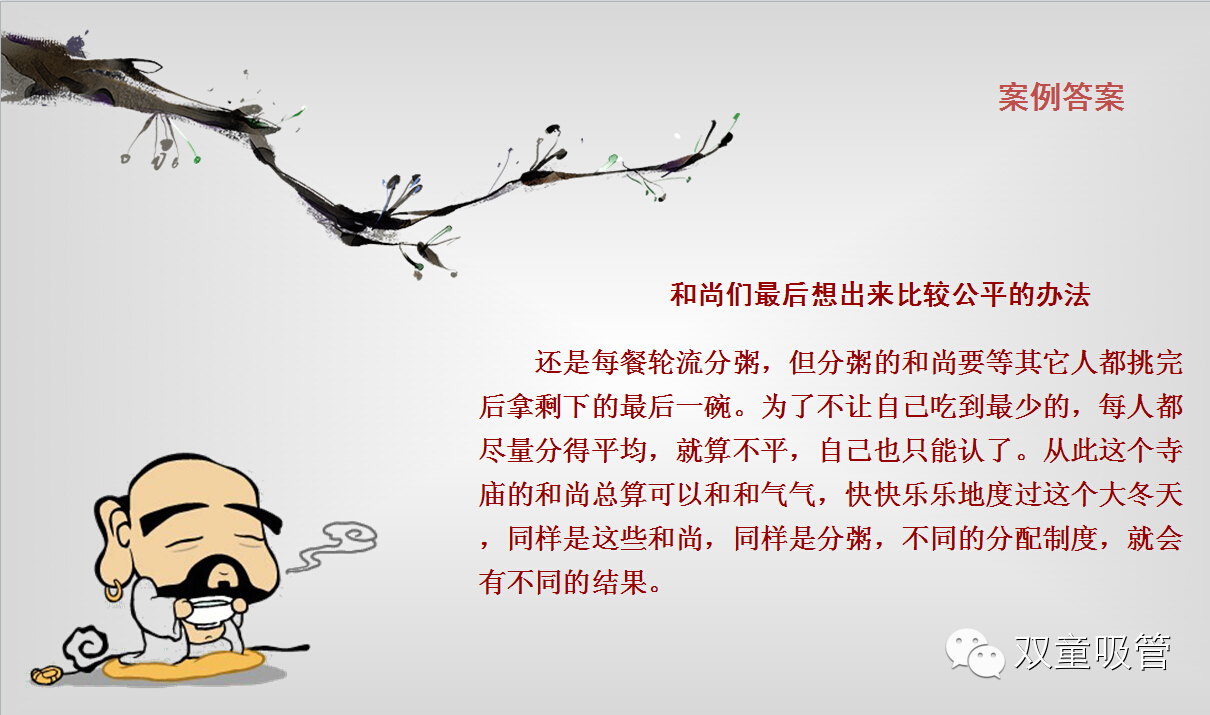 有一個(gè)山間寺廟住著(zhù)一大班小和尚,因為大雪封山無(wú)法下山化緣施舍,老和尚也因為下山化緣而無(wú)法回到寺廟,每天兩餐都要靠山上村民施舍的一大桶粥過(guò)日子,要命的是人多粥少,每天都是不夠吃的。一開(kāi)始他們抓鬮決定誰(shuí)來(lái)分粥,每天由一個(gè)小和尚輪流分粥。于是乎每一圈下來(lái)他們只有一天是飽的,就是自己分粥的那一天;后來(lái)他們開(kāi)始推選出一個(gè)道德高尚的和尚每天分粥,結果所有和尚開(kāi)始挖空心思去討好他,賄賂他,一段時(shí)間后,搞得整個(gè)寺廟烏煙障氣;然后實(shí)在沒(méi)有辦法,大家又開(kāi)始組成分粥委員會(huì )和監督小組,結果也是互相攻擊、相互扯皮,每餐都要花很長(cháng)的時(shí)間進(jìn)行分粥,雖然對公平了,但吃到嘴里的粥全是冰冷冷的。