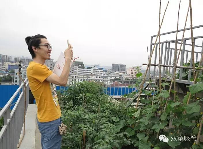 看,我們的大主持人田野在參觀(guān)九樓菜園看到這么一片原生態(tài)的“田野”也禁不住拿出手機拍幾張啦!而調皮的當家人非要拉著(zhù)田野在自己的“田野”里拍照留念。吸管妞真想對當家人說(shuō),讓我也來(lái)合影幾張呀!