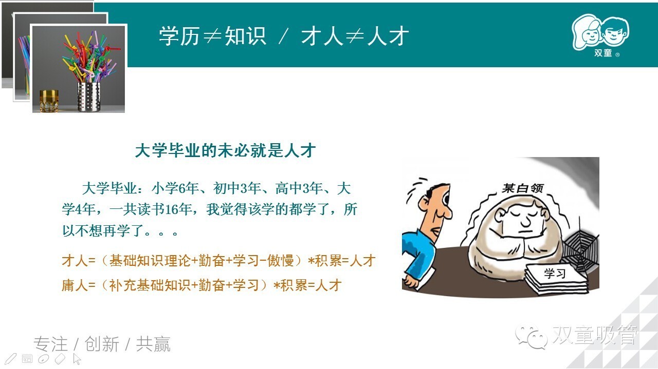 當家人樓總勉勵大家,一定要堅持學(xué)習,學(xué)習并不是學(xué)校里才需要做的事!如果工作以后就不思進(jìn)取,不學(xué)習提升,就算是博士生,雙童也不會(huì )對你敞開(kāi)大門(mén)!而對于那些肯學(xué)習、肯鉆研的員工,雙童會(huì )提供非常多的學(xué)習機會(huì )和提升空間,讓你在雙童有一個(gè)更好的發(fā)展!就算有一天你離開(kāi)了雙童,你學(xué)到的始終是你自己的!真摯的話(huà)語(yǔ)深深地感染了在座的員工們,相信以后雙童的學(xué)習氛圍會(huì )更好!
