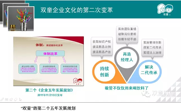 2011年,雙童吸管開(kāi)始做第二個(gè)五年規劃,通過(guò)產(chǎn)品創(chuàng )新、團隊再造、體制改革三個(gè)方面進(jìn)行發(fā)展。