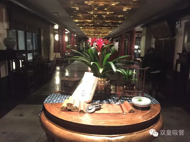 我們入住烏鎮景區內的昭明書(shū)舍酒店,酒店大堂的燈都是用書(shū)簡(jiǎn)裝飾,文房四寶靜靜擺放其中,別有格調。