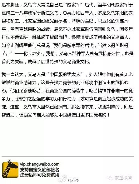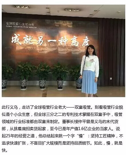 6月2日,“雙童”來(lái)了幾位貴客,有微博紅人@傳媒老王 ,也有著(zhù)名作家蘇芩。當家人樓總向來(lái)喜歡交“網(wǎng)友”,見(jiàn)到幾位大咖更是熱情接待。這不,作家蘇芩在回去后,在微博上寫(xiě)了一篇關(guān)于義烏的文章,里面也重點(diǎn)提到了“雙童”的工匠精神和精細化管理呢!下面妞就把這篇文章照搬過(guò)來(lái),和大家一起分享!
